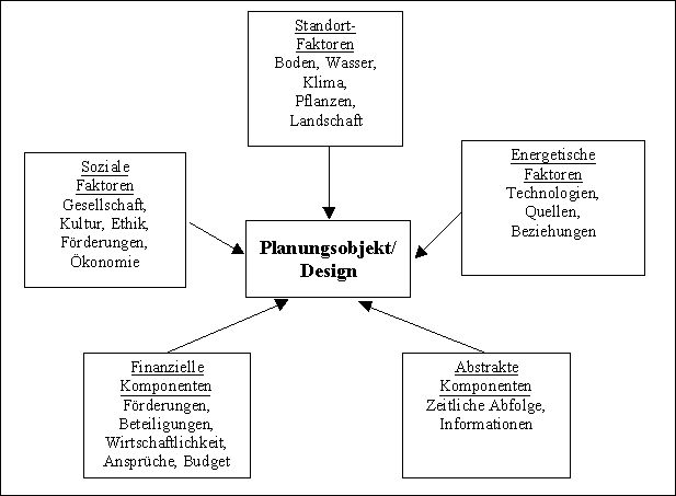 Permakultur Die Permakultur (von "permanent" und "agriculture") wurde ca. 1978 von den Australiern Bill Mollison und David Holmgren begründet. Sie entwickelten sie aus der Erkenntnis heraus, daß die Landwirtschaft zur Vergeudung von Ressourcen und zur Verödung der Landschaft beitrug. Ihre Vision war die einer Landbewirtschaftung und einer Lebensweise im "Einklang mit der Natur", basierend auf Naturbeobachtung, traditionellen Anbaumethoden und der Nutzung neuer umweltverträglicher Techniken. Ziel der Permakultur ist es ein System aus Flächen, Gebäuden und Nutzern zu schaffen, dessen einzelne Bestandteile sich gegenseitig ergänzen und fördern. Es soll dauerhaft und vielfältig nutzbar sowie produktiv sein und im Idealfall mit einem Minimum an Fremdenergie auskommen, indem es die vorhandenen Kräfte und Ressourcen nutzt. Die Funktion des Menschen soll dabei nicht die eines ständigen (Um-) Gestalters sondern eher die eines Initiators und Steuermanns des Systems sein. In die Planungen ("Designs") fließen standörtliche, energetische und soziale Faktoren sowie ihre Beziehungen untereinander ein (s. Abb. 1). | |