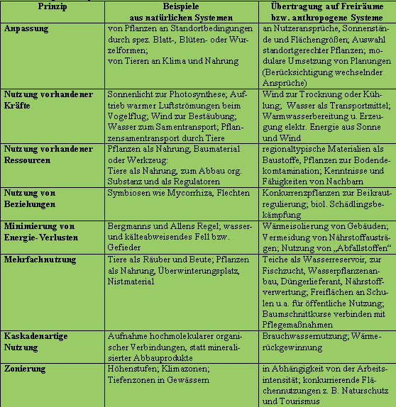 I. Energie Jegliche Aktivität auf der Erde ist von Energie abhängig, die u. a. in Form von Strahlungsenergie, gespeicherter Energie in org. Substanz, mechanischer Energie oder Wärmeenergie auftritt. Energie geht in jedem offenen System ständig verloren, z. B. in Form von Wärme, weshalb es auch keinen Energiekreislauf, sondern nur einen Energie(durch)fluß gibt. Ein wesentliches Ziel natürlicher Systeme ist es diese Energie möglichst lange innerhalb des Systems zu speichern, effektiv zu nutzen und Verluste zu minimieren. Die Art und Weise des Energieflusses entscheidet darüber, ob ein System nachhaltig, ressourcenschonend und (energie-)effizient ist. Tab. 1 zeigt beispielhaft mögliche Anwendungen dieser "energetischen" Prinzipien in natürlichen und anthropogenen Systemen. Die Berücksichtigung dieser Regeln hilft: · Standorteigenschaften besser zu nutzen, · kostspielige und aufwendige technische Lösungen zu vermeiden und damit · Energie und kostbare Ressourcen zu sparen. Prinzipien · Anpassung an Standortbedingungen Berücksichtigung mikro- und makroklimatischer Faktoren, Bodenart und -typ, Lage, Neigung, Höhe über NN. · Nutzung vorhandener Kräfte Kräfte als Energien im engeren Sinne (Sonne, Wind- und Wasserkraft, Verrottungswärme) · Nutzung vorhandener materieller und nicht materieller Ressourcen Hilfsmittel und -stoffe zur nachhaltigen Produktion, wie z. B. Boden, Pflanzen, Tiere, Nachbarn, Informationen... · Nutzung von Beziehungen Symbiosen, Kooperationen, Konkurrenzen, Parasitismus u. a. · Minimierung von Energie-Verlusten Verluste entstehen durch unzureichende Energiespeicher, zu schnellen Energiedurchfluß oder durch die ersetzbare Verwendung von Fremdenergie. · Mehrfach- und kaskadenartige Nutzung Hierdurch wird der Stoff- und Energiedurchsatz reduziert, der Vernetzungsgrad erhöht und der Energie- und Materialaufwand verringert. Energie- oder Ressourcennutzung über mehrere Zwischenstufen (Kaskaden). · Zonierung Zonen unterschiedlicher Energieeinwirkung. |