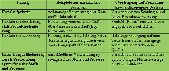 I. Energie Jegliche Aktivität auf der Erde ist von Energie abhängig, die u. a. in Form von Strahlungsenergie, gespeicherter Energie in org. Substanz, mechanischer Energie oder Wärmeenergie auftritt. Energie geht in jedem offenen System ständig verloren, z. B. in Form von Wärme, weshalb es auch keinen Energiekreislauf, sondern nur einen Energie(durch)fluß gibt. Ein wesentliches Ziel natürlicher Systeme ist es diese Energie möglichst lange innerhalb des Systems zu speichern, effektiv zu nutzen und Verluste zu minimieren. Die Art und Weise des Energieflusses entscheidet darüber, ob ein System nachhaltig, ressourcenschonend und (energie-)effizient ist. Tab. 1 zeigt beispielhaft mögliche Anwendungen dieser "energetischen" Prinzipien in natürlichen und anthropogenen Systemen. Die Berücksichtigung dieser Regeln hilft: · Standorteigenschaften besser zu nutzen, · kostspielige und aufwendige technische Lösungen zu vermeiden und damit · Energie und kostbare Ressourcen zu sparen. Prinzipien · Anpassung an Standortbedingungen Berücksichtigung mikro- und makroklimatischer Faktoren, Bodenart und -typ, Lage, Neigung, Höhe über NN. · Nutzung vorhandener Kräfte Kräfte als Energien im engeren Sinne (Sonne, Wind- und Wasserkraft, Verrottungswärme) · Nutzung vorhandener materieller und nicht materieller Ressourcen Hilfsmittel und -stoffe zur nachhaltigen Produktion, wie z. B. Boden, Pflanzen, Tiere, Nachbarn, Informationen... · Nutzung von Beziehungen Symbiosen, Kooperationen, Konkurrenzen, Parasitismus u. a. · Minimierung von Energie-Verlusten Verluste entstehen durch unzureichende Energiespeicher, zu schnellen Energiedurchfluß oder durch die ersetzbare Verwendung von Fremdenergie. · Mehrfach- und kaskadenartige Nutzung Hierdurch wird der Stoff- und Energiedurchsatz reduziert, der Vernetzungsgrad erhöht und der Energie- und Materialaufwand verringert. Energie- oder Ressourcennutzung über mehrere Zwischenstufen (Kaskaden). · Zonierung Zonen unterschiedlicher Energieeinwirkung. |