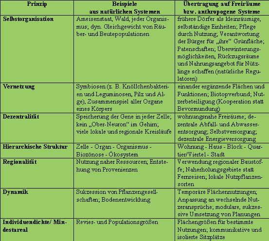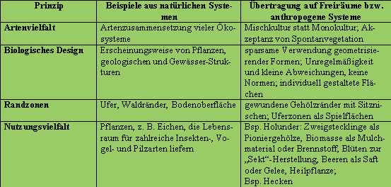 IV. Vielfalt Natürliche Lebensräume zeichnen sich in der Regel durch eine große Vielfalt aus, die sich in eine "äußere", sichtbare und eine "innere", unsichtbare unterteilen läßt. Die äußere zeigt sich in der Vielfalt an Arten, Standortbedingungen (z. B. warme, sonnige und kühle, schattige Bereiche), Erzeugnissen, Landschaftsbildern (Farben, Formen, Geräuschen und Gerüchen). Die "innere", weniger offensichtliche, in der Vielfalt der Beziehungen und Funktionen. Um alle Vorteile der Vielfalt nutzen zu können, ist es wichtig darauf zu achten, daß sie nicht nur die äußere Qualität aufweist, die sich als ein Nebeneinander unterschiedlicher Komponenten zeigt, sondern, daß die innere Qualität im Vordergrund steht. Ziel muß eine geschickt angeordnete, vernetzte "Polykultur" sein, die das Gegenteil einer "Monokultur" darstellt. Diese unsichtbaren Strukturen sind aber ungleich schwieriger zu planen und zu verwirklichen und werden sich oft erst im Laufe der Jahre ergeben, nachdem erfolglose Arten oder Methoden ausgeschieden sind oder aufgegeben wurden und besser geeignete sich etabliert haben. Prinzipien · Artenvielfalt Obwohl es auch artenarme stabile Lebensräume gibt (z. B. Schilfgürtel oder Buchenwälder), weisen die meisten natürliche Systeme eine große Artenvielfalt auf. Sie bietet Vorteile für den Erhalt und die Funktionsfähigkeit des Systems, denn ein Nachteil von Monokulturen und Monostrukturen ist, daß alle Individuen Bedarf an den gleichen Ressourcen haben und die gleichen Abfälle produzieren. · Biologisches Design Die Vielfalt an Formen und Strukturen der Organismen - das biologische Design - hat in der Regel einen funktionellen Charakter und wird von Menschen in seiner "Unregelmäßigkeit in der Regelmäßigkeit" als ästhetisch ansprechend empfunden (Vester 1999). Architekten und Ingenieure greifen diese Art der Gestaltung nicht nur unter optisch-ästhetischen Aspekten auf, sondern versuchen mittlerweile durch die Nachahmung natürlicher Gestaltungsregeln u. a. energie- und kostensparende Bauweisen und neue technische Möglichkeiten zu verwirklichen ("Bionik" aus Biologie und Technik). · Randzonen In natürlichen Systemen ist häufig zu beobachten, daß Randzonen (Ökotone), d. h. die Übergänge zwischen zwei Lebensräumen sehr artenreich sind. Dies ist u. a. darauf zurückzuführen, daß dieser Bereich Arten der beiden angrenzenden Biotope enthält und darüberhinaus Arten, die auf den Übergangsbereich spezialisiert sind. Beispiele hierfür sind Waldränder, Küsten oder die Bodenoberfläche als Grenzbereich zwischen Atmo- und Lithosphäre. Eine Verlängerung von Randzonen z. B. durch gewundenen, unregelmäßigen Heckenverlauf, schafft unterschiedliche mikroklimatische Bedingungen (Licht-, Wind- und Feuchteverhältnisse), die die Standortvielfalt erhöhen. An den Randzonen kann es zu Anreicherungen wind- und wassertransportierter Stoffe (mit Nähr- oder Schadfunktion) kommen, was z. B. die Aufgabe von Erosionsschutz- oder Filterhecken ist. Auch wenn Ränder nutzbare Eigenschaften aufweisen, kann es sinnvoll sein diese zu verlängern, z. B. Flachwasserzonen zum Anbau bestimmter Pflanzen. Auch der Stadtrand ist als menschlicher Lebensraum äußerst begehrt, da er die Vorzüge der Stadt, wie Nähe zu Geschäften, Schulen und Freizeitangeboten, mit denen des ländlichen Raumes, wie Ruhe, Grünflächen und bessere Luftqualität, verbindet. · Vielfalt an Nutzungsmöglichkeiten Die Komponenten natürlicher Systeme weisen oft eine Vielfalt an Nutzungsmöglichkeiten auf, z. B. Pflanzen, deren Blätter von Raupen gefressen werden, die Blüten Nektar für Bienen bieten und die hohlen Stengel als Überwinterungsquartier oder Nistmaterial dienen. |